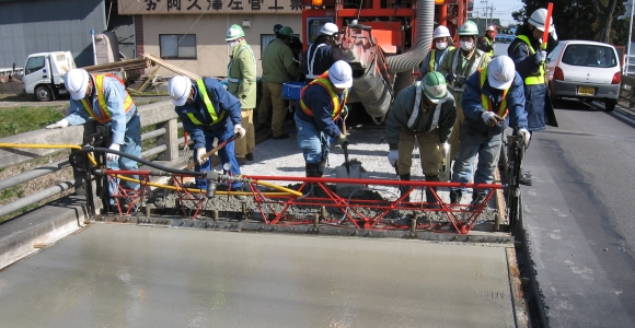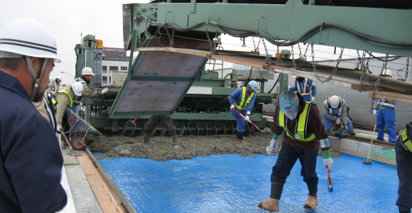 練り落としスランプ5cm、横断勾配最大8%、打設幅3.5mから5.0m。